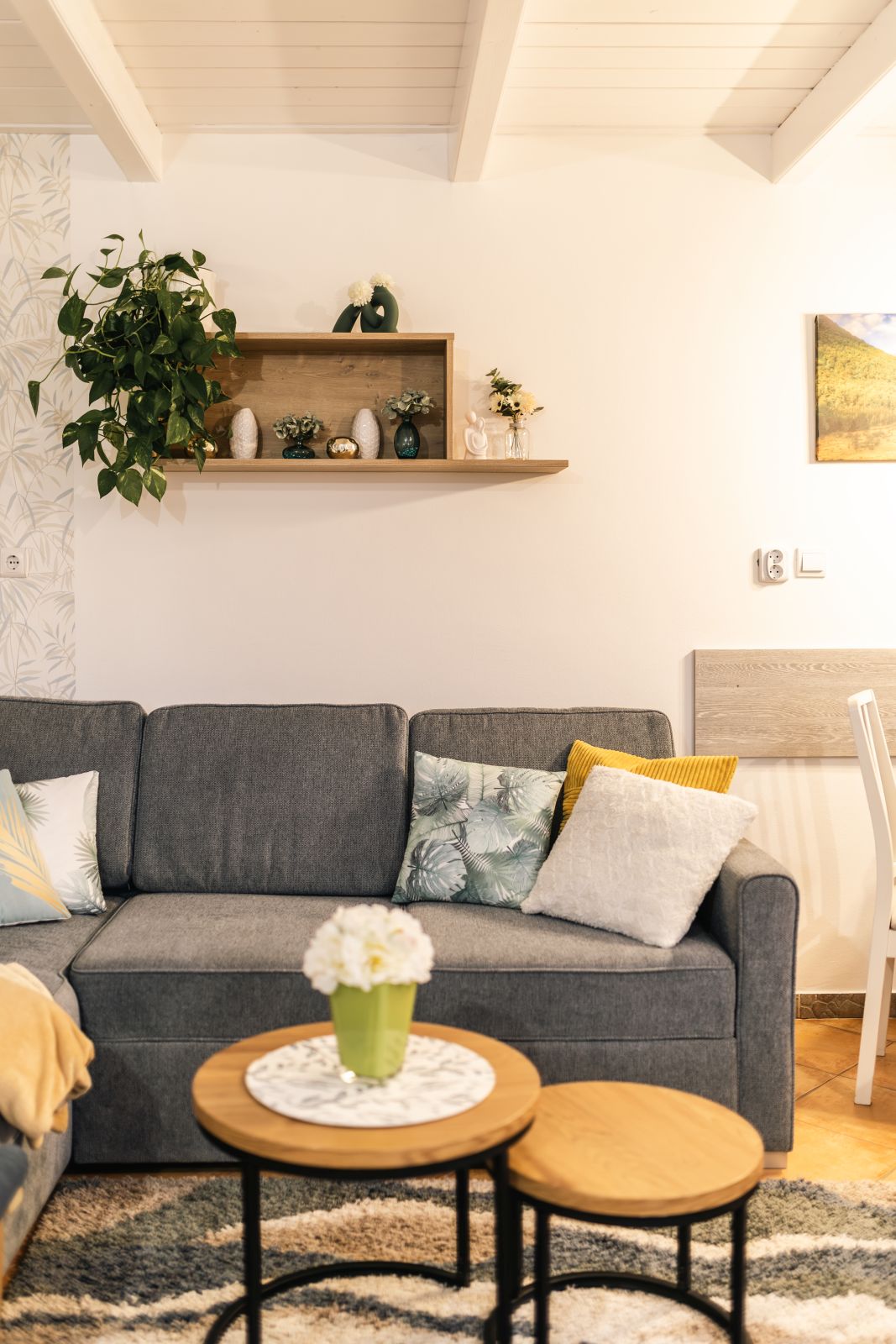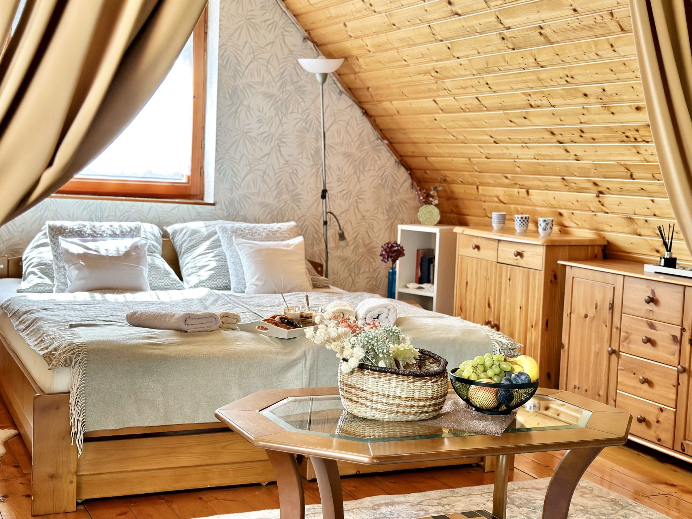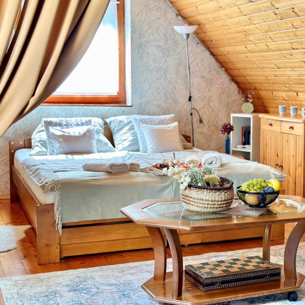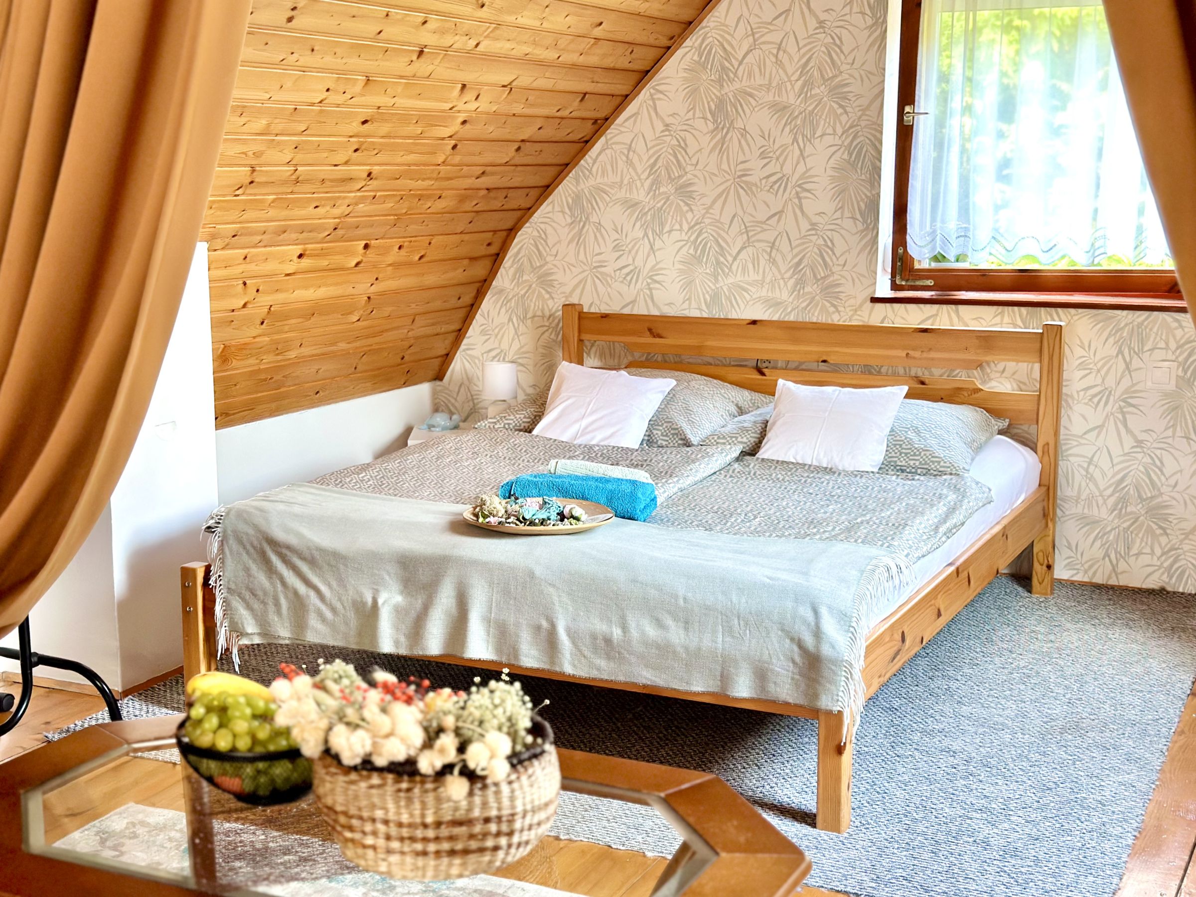 A folyamatosan szépített és karbantartott, kétszintes vendégházunkban hét fő is kényelmesen elfér, de akár ketten, akár heten érkeztek, a nálunk töltött idő alatt minden rólatok szól, garantáltan nem kell más vendéggel osztoznotok semmin. Az emeleten egy egylégterű, családi szobában két franciaágy és egy egyszemélyes ágy, a földszinten pedig egy kétszemélyesre nyitható kanapéágy is rendelkezésre áll. A fürdőszobában tusfürdő, szappan, törölközők, hajszárító van bekészítve, így azt sem kell hoznotok.