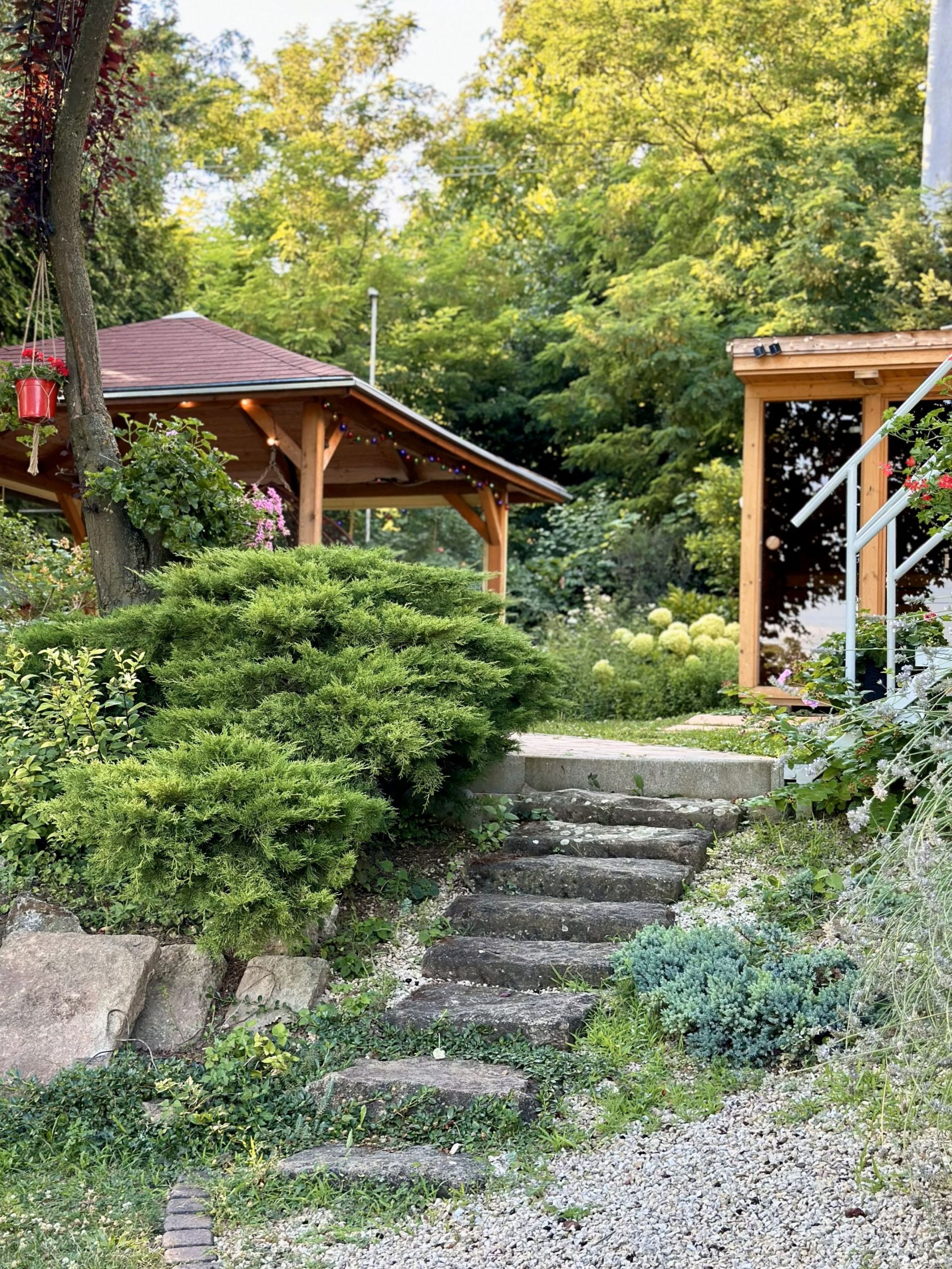 Privát wellness, kandalló, grillező. Csend és panoráma. Virágok és madárcsicsergés. Nálunk a kényelem és az élmények nem csak a házba belépve, hanem már a kertben elkezdődnek. A Moson Patak Vendégház több, mint 1000 négyzetméteres, parkosított saját kerttel rendelkezik, ahol a fák árnyékában és a gondosan ápolt virágok közt, hintaágyban üldögélve csodálhatod a Nagymarosról nyíló panorámát. Kerti bútorok, napozóágyak, grillező és bográcsozó várja, hogy kiélvezzétek a minden kényelemmel ellátott privát szférát.